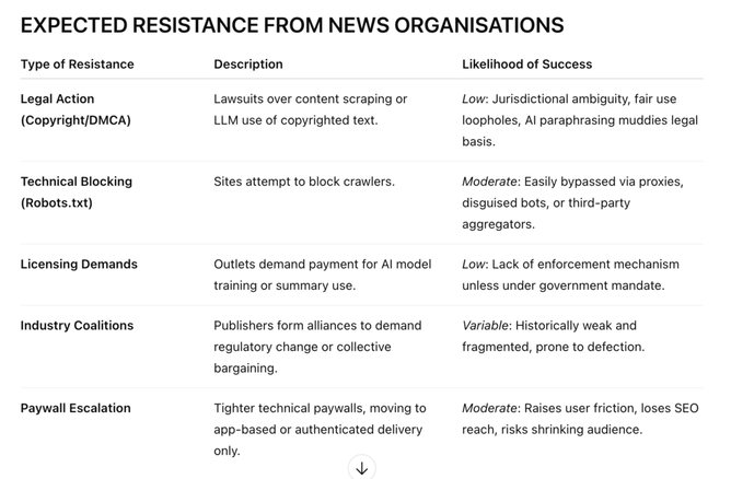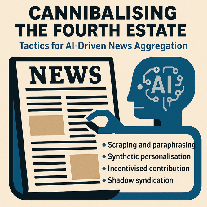 AI technologists can and will cannibalise news services in the absence of robust regulation or ethical enforcement. By exploiting grey areas in copyright law, paraphrasing content, leveraging personalisation algorithms, and strategically undermining publisher resistance, these systems can create a façade of original news while hollowing out the foundations of journalism.