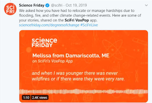 Science Friday for example uses VoxPop for different segments of the weekly radio show and podcasts and then packages it up for a digital audience on different platforms including the web site, You Tube, Soundcloud, Twitter and Facebook.